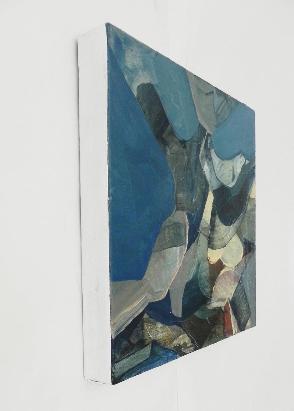 Melt No 3 suggests light from beneath water. The square canvas allows for a sense of both energy and stillness at the same time. Reductive painting methods create moments of space within flatness, while the blue and yellow palette speak to submersion and discovery.